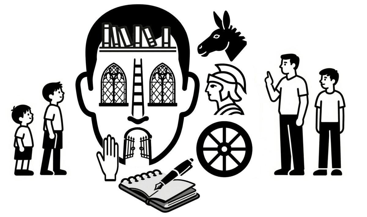 La testa poggia su un carro che ha la forma di un quaderno dotato di ruote, per ricordarci che partiremo dagli appunti scolastici, i quali saranno la base documentaria delle nostre immagini di memoria. Seduti sul quaderno, sotto la testa, quattro studenti di età diverse: bambino, ragazzo delle medie, adolescente, giovane universitario, per simboleggiare i diversi destinatari di questa rubrica. Questi studenti non sono estranei l’uno all’altro, ma si guardano a vicenda, per ricordarci l’importanza del tutoraggio reciproco. Accanto alle due orecchie, da un lato un genio maligno con una testa d’asino che parla (il cattivo insegnante, quello che crea ansia da prestazione e competizione), dall’altro una donna alata con un elmo (la dea Atena, che simboleggia la sapienza). Ecco un’immagine indelebile che ci consentirà di riassumere tutto il contenuto di questo articolo, in modo non letterale ma concettuale.