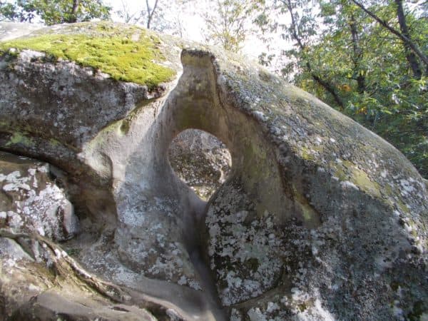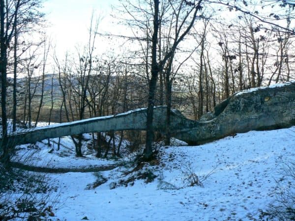 Come puoi notare nella galleria d’immagini più avanti non si tratta di un ponte vero e proprio, è piuttosto un monolito d’arenaria posto di traverso a quello che un tempo fu l’alveo d’un corso d’acqua. Le rocce del posto sono ricche di iodio, per questo motivo le sorgenti locali venivan considerate curative in modo particolare per gli abitanti della montagna, che di quel minerale in genere patiscono la carenza. Si dice infatti che a questo siano da attribuire non solo patologie come il gozzo e l’afta epizootica, ma anche in un senso più ampio l’instabilità dell’umore e altri problemi legati alla tiroide. Le acque della vicina fonte Brendana venivano imbottigliate con tanto di sigillo per evitare le contraffazioni fin dal XVIII secolo, anche se oggi il letto del torrente è asciutto. Non stupisce dunque se il sito sia stato frequentato fin dall’epoca preistorica, come attestato da varie iscrizioni rupestri che non furono certo opera d’improbabili ‘atlantidei’, ma di più documentabili osco-umbri, popolazioni la cui presenza sul territorio è ampiamente documentata fino alla conquista romana avvenuta più o meno cent’anni prima dell’era volgare.
